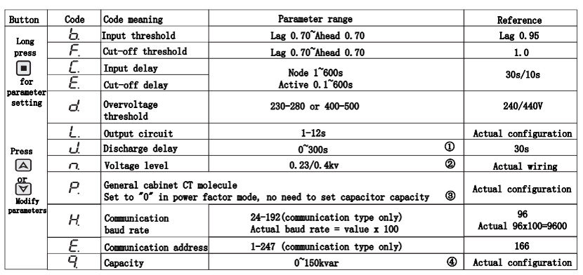 ③0 means power factor mode, no need to set capacitor capacity,and the displayed current and reactive power are secondary values; greater than 0 means reactive power mode,need to set capacitor capacity, and the displayed current and reactive power are primary values.